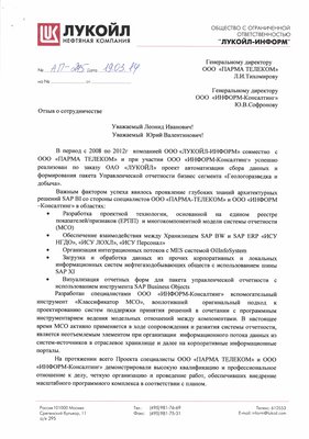 Компанией Информ-Консалтинг получен новый отзыв по итогам масштабного проекта автоматизации сбора данных и формирования пакета Управленческой отчётности бизнес-сегмента «Геологоразведка и добыча» ОАО «ЛУКОЙЛ» , длившегося с 2008 по 2012 годы. Помимо глубоких знаний архитектурных решений SAP BI заказчиком отмечается оригинальный подход специалистов Информ-Консалтинг к проектированию корпоративных систем поддержки принятия решений, основанный на моделировании отношений между отчетными показателями, признаками показателей, формами отчетности, источниками отчетных данных, подотчетными организациями и т.д. в среде программного инструментария собственной разработки. С более подробной информацией по проекту можно ознакомиться по ссылке в разделе Проекты.