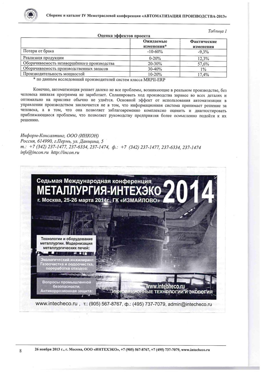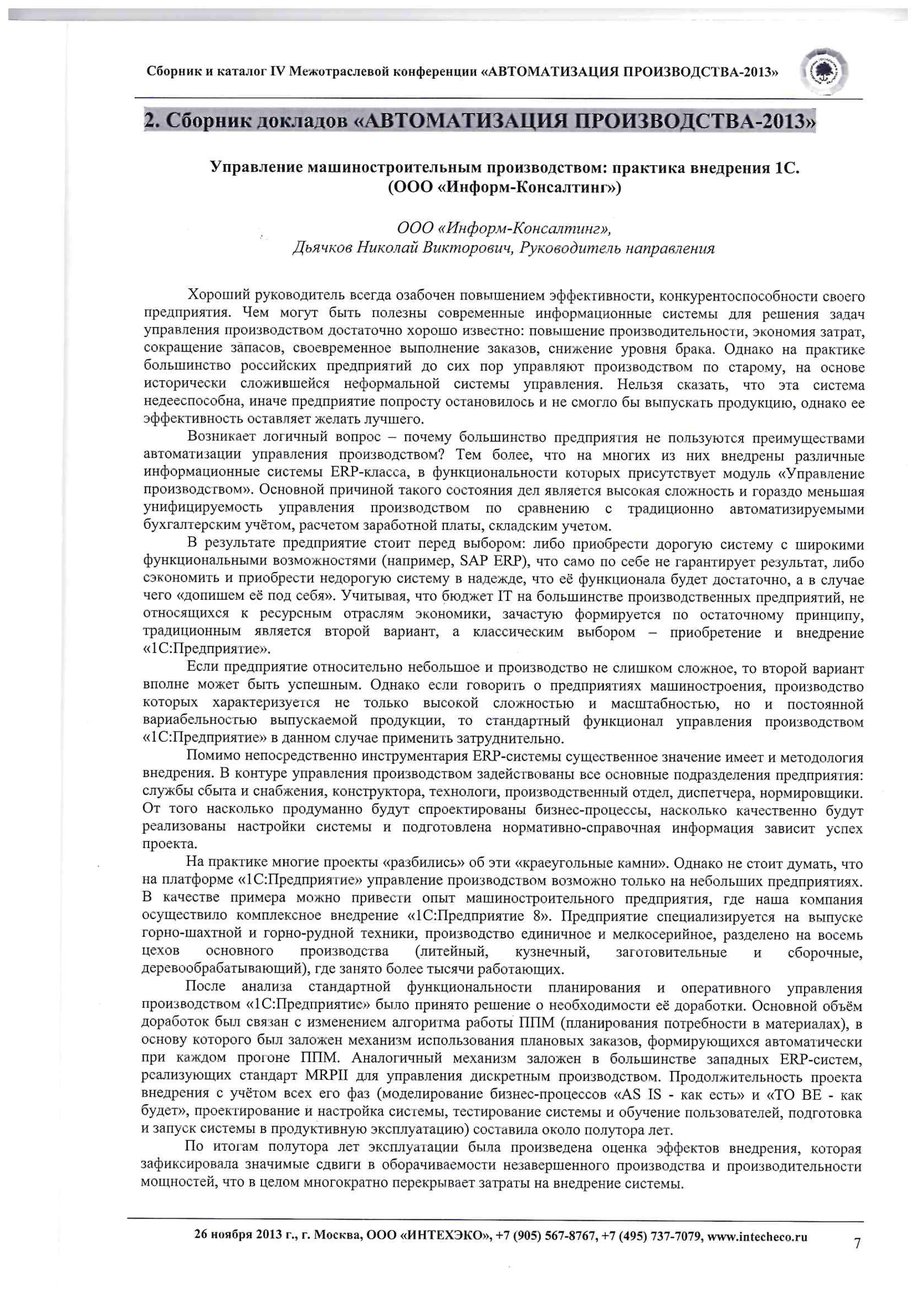 В сборнике докладов конференции опубликована статья Николая Дьячкова (руководитель направления компании Информ-Консалтинг) «Управление машиностроительным производством: практика внедрения 1С ».