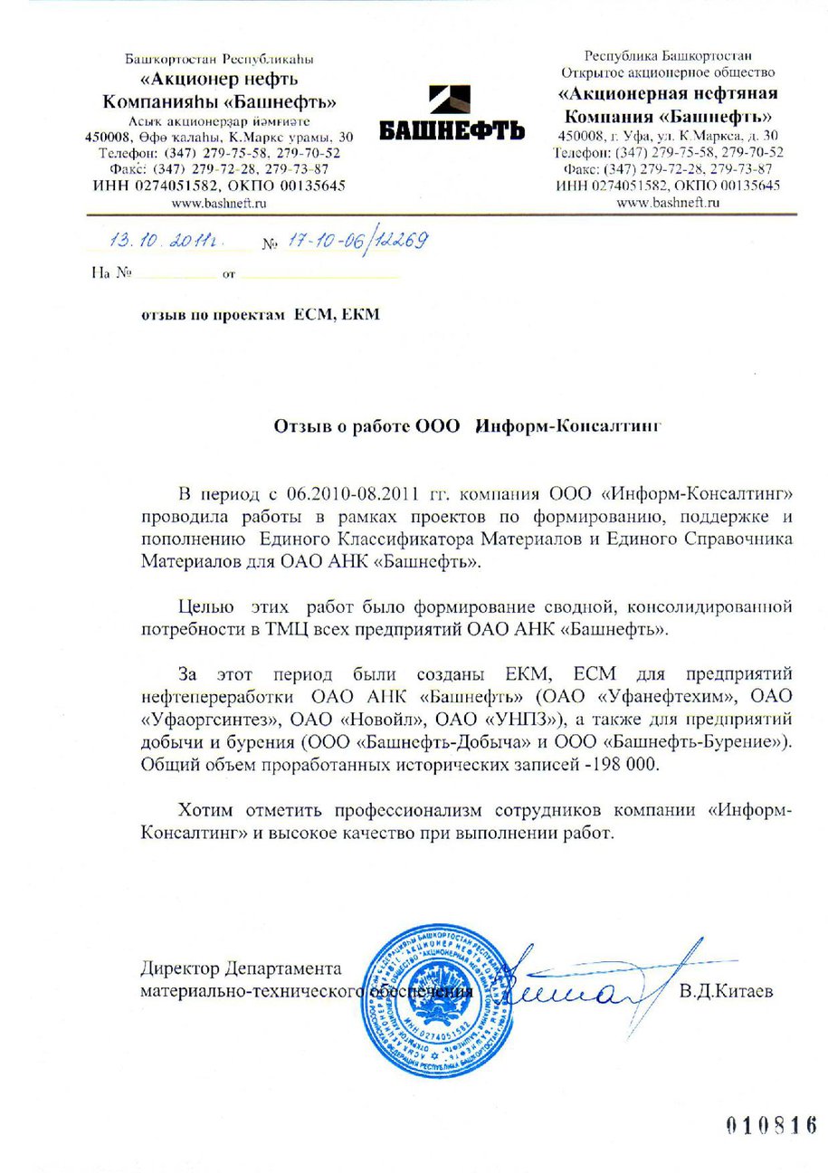 Отзыв директора Департамента материально-технического обеспечения ОАО АНК "Башнефть" В.Д.Китаева о проекте внедрения классификатора материалов.