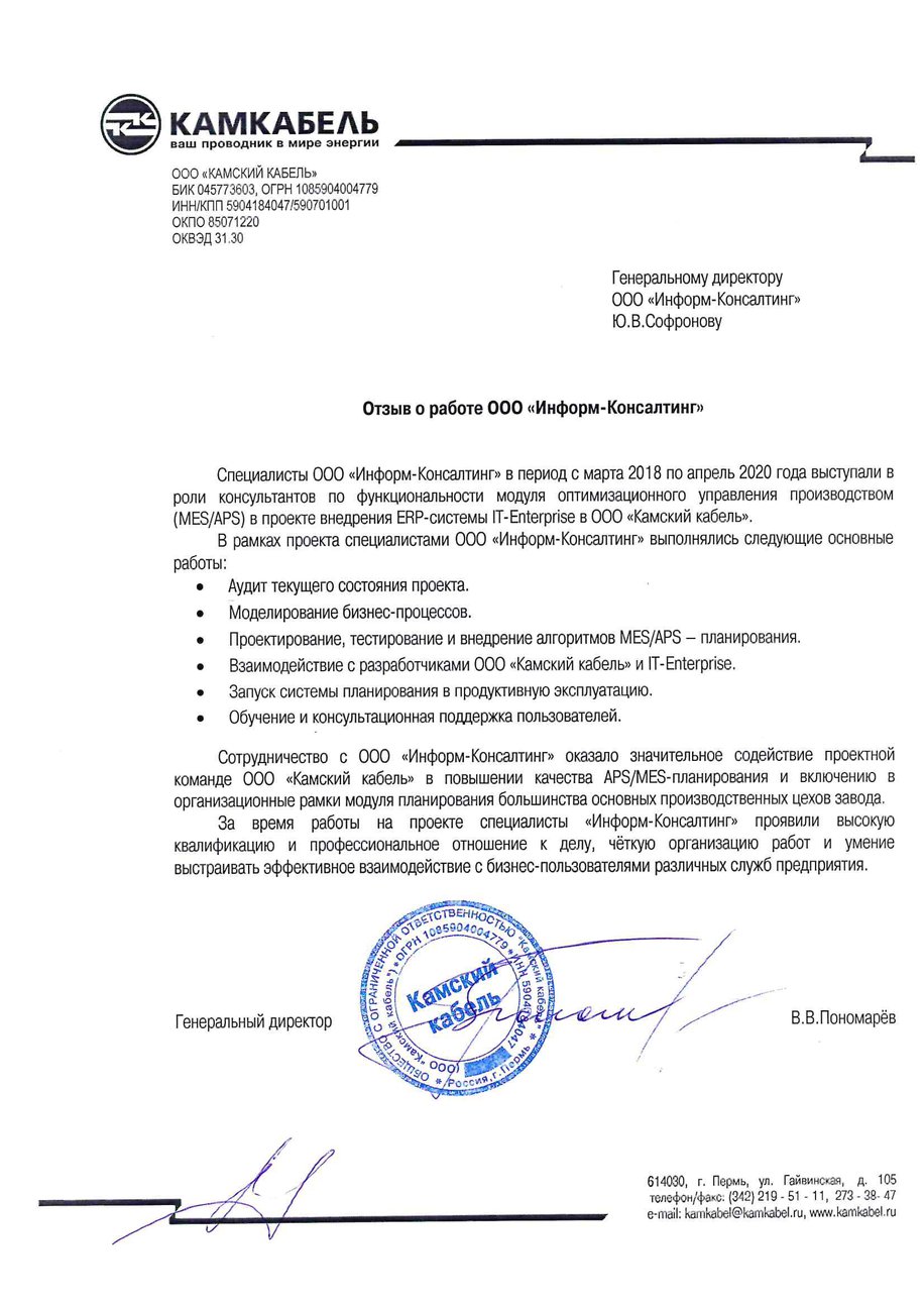 Отзыв генерального директора ООО "Камский кабель" В.В.Пономарёва о проекте внедрения APS/MES-системы на платформе "IT-Enterprise".