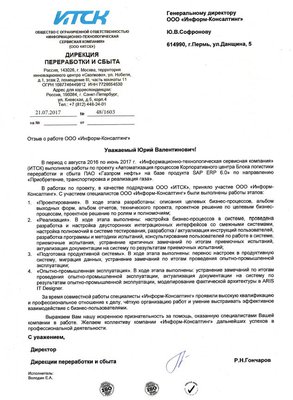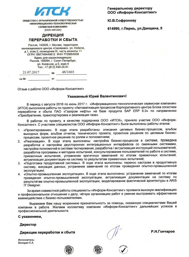 Отзыв директора дирекции переработки и сбыта ООО "ИТСК" Р.Н.Гончарова о проекте развития SAP ERP.